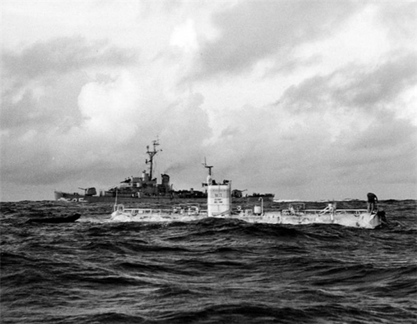 Tàu ngầm thăm dò của Hải quân Mỹ, Bathyscaphe Trieste trưa ngày 23 tháng 1 năm 1960 trước khi lặn xuống.