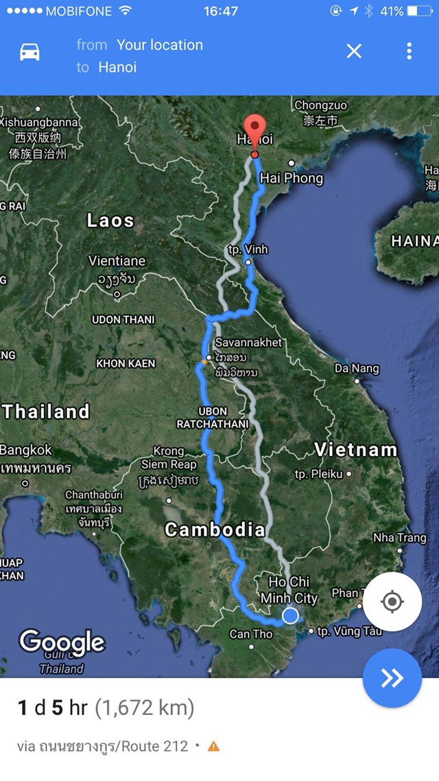 Nếu lái xe từ TP HCM, bạn phải đi qua Campuchia, Thái Lan, Lào để đến được Thủ đô Hà Nội.