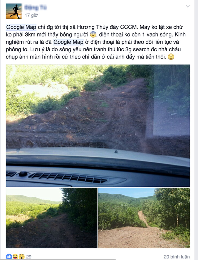 Tương tự trường hợp trên, một người dùng khác cũng dùng Google Maps trong chuyến công tác từ Hà Nội vào Huế. Anh tìm lộ trình đến thị xã Hương Thủy thì bị nhầm sang một đoạn đường núi, không thể tiếp tục đi nên quyết định quay lại.