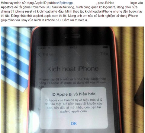 Một cư dân mạng chia sẻ về hiện tượng iPhone bị khoá khi dùng Apple ID lạ để cài Pokemon Go.
