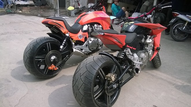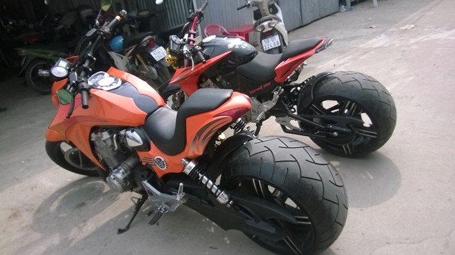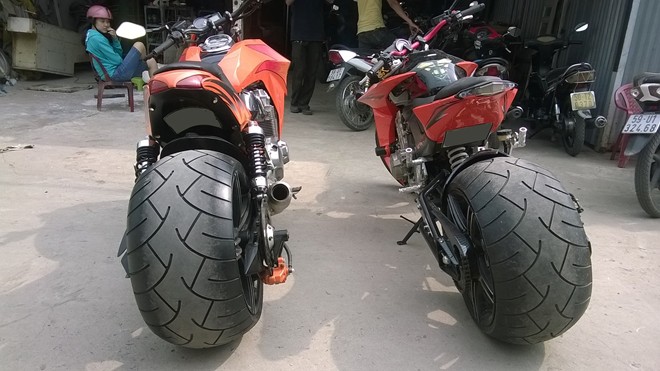 Cả 2 mẫu xe độ đều sử dụng bộ bánh kích thước 300/35-18 được nhập khẩu. Trong khi đó, gắp sau của xe do chính những người thợ của xưởng độ tự chế tạo.