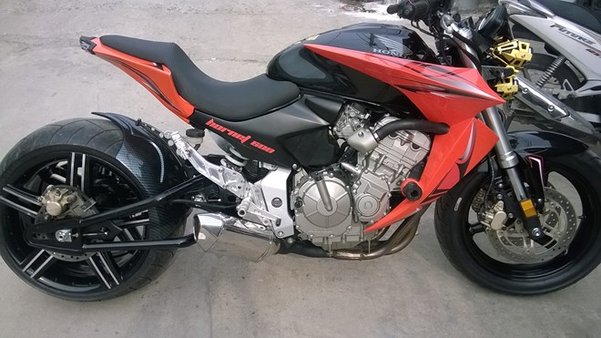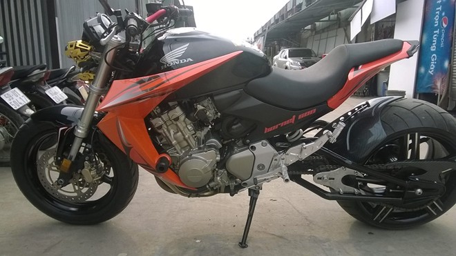 Trong khi đó, toàn bộ thân xe hầu như được thiết kế lại hết. Chủ xưởng độ cho biết, dàn vỏ ốp bình xăng của chiếc Hornet 600 này được nhập khẩu tử Mỹ. Yên xe được anh chế lại. Bộ vành bánh sau được người thợ Sài Gòn này tự chế từ vành ô tô.