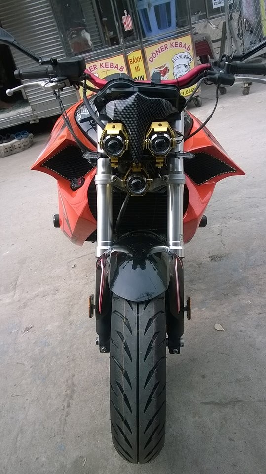 Phần đầu xe có thiết kế hầm hố với cụm đèn pha sử dụng bóng gương cầu độc đáo và chi tiết ốp từ sợi carbon. Bên cạnh đó, dàn vỏ ốp bình xăng với thiết kế góc cạnh càng làm tăng thêm vẻ dữ tợn của chiếc xe.