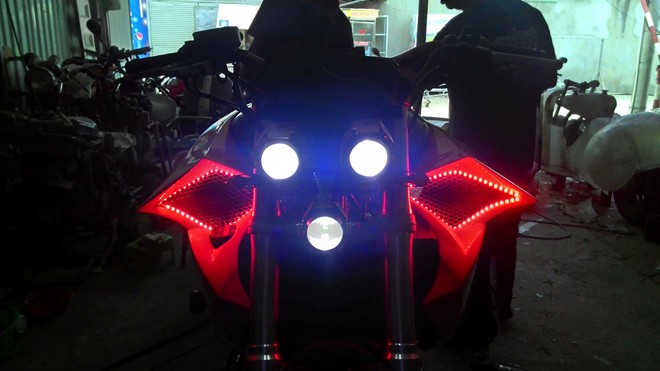 Quanh hai hốc hút gió trên ốp bình xăng, chủ lò độ đang trang bị thêm dài đèn LED tạo hiệu ứng đẹp mắt khi kết hợp với đèn pha vào ban đêm.