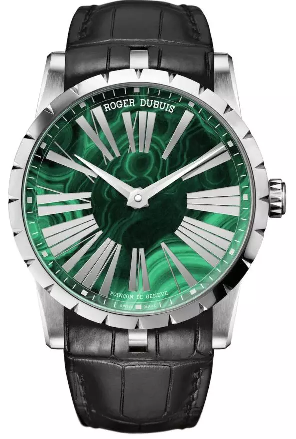 Mỗi chiếc được cấu tạo với mặt số bằng Malachite, kim giờ, kim phút làm bằng bạc cùng chữ số La mã và vỏ ngoài bằng thép không gỉ. Nắp lưng saphire còn có chữ ký Roger Dubuis đầy mê hoặc trên micro-rotor bên trong đồng hồ.