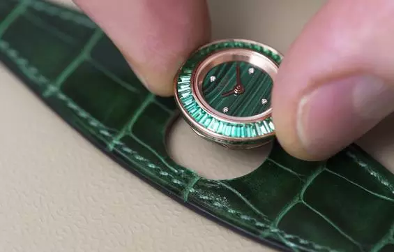 Faubourg Manchette Joaillerie là sự kết hợp vô cùng tinh tế: vỏ ngoài hình tròn với đường kính nhỏ gọn 19,5mm được làm bằng vàng hồng, 4 viên kim cương lóng lánh nổi bật trên nên nền mặt số làm bằng khoáng chất Malachite.
