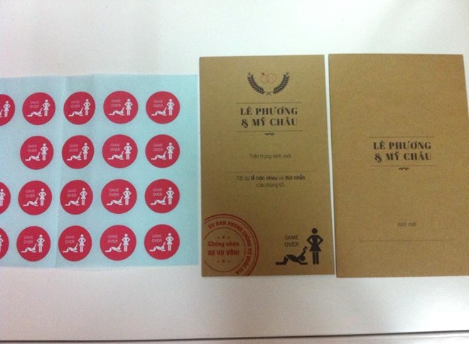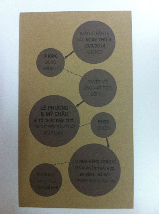 Chia sẻ về mẫu thiệp độc đáo, lạ mắt này, anh Phương nói:“Đây là mẫu thiệp cưới do mình nghĩ ra như là một điều kỉ niệm ngày trọng đài trong cuộc đời mình. Bạn bè đều là những người trẻ cũng không cần quá nghiêm túc, mình nghĩ ra mẫu thiệp có phần hài hước, để mọi người có thể giữ lại làm kỷ niệm và nhớ về đám cưới của mình.”