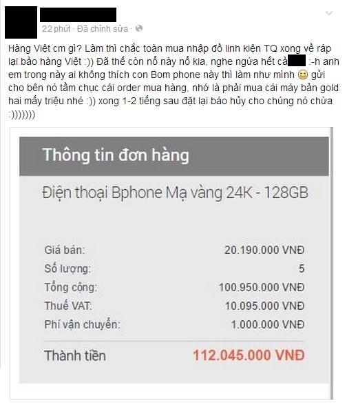Sau khi nói những lời lẽ tính chất dìm hàng Việt không thương tiếc, thanh viên này đã tiếp tục đăng tải lên Facebook hình ảnh hóa đơn xác nhận việc anh hủy đặt mua 5 chiếc Bphone (phiên bản Mạ vàng 24K - 128 GB) trị giá tổng 112.045.000 VND như một "chiến tích" để đời. Không những vậy, người này còn không ngượng miệng kêu gọi nhiều người khác làm theo hành động đáng xấu hổ của mình.