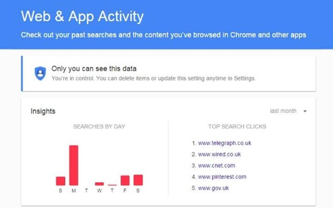 Nếu muốn, người dùng có thể xóa các dữ liệu tìm kiếm mà Google đã lưu lại bằng cách nhấp chuột vào mục 3 dấu chấm ở phía trên bên phải màn hình và chọn mục xóa. Bảng thông báo hiện ra có các sự lựa chọn như “Hôm nay” hay “Hôm qua”. Nếu chọn vào mục “Mở rộng”, người dùng có thể xóa thông tin từ 4 tuần trước hay “tất cả thời gian”.