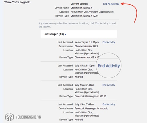 Nếu thấy một thiết bị lạ hoặc phát hiện vị trí bất thường, bạn chỉ cần nhấp vào tùy chọn End Activity để đăng xuất từ xa hoặc End All Activity để dừng tất cả mọi hoạt động.