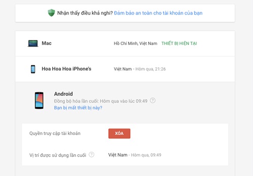 Đối với tài khoản Google, bạn chỉ cần truy cập vào https://goo.gl/nbVbd để xem danh sách các thiết bị đã đăng nhập gần đây. Nếu thấy có một thiết bị lạ, bạn chỉ cần chọn vào đó và nhấn Xóa để lấy lại quyền truy cập, sau đó tiến hành đổi mật khẩu để được an toàn hơn.