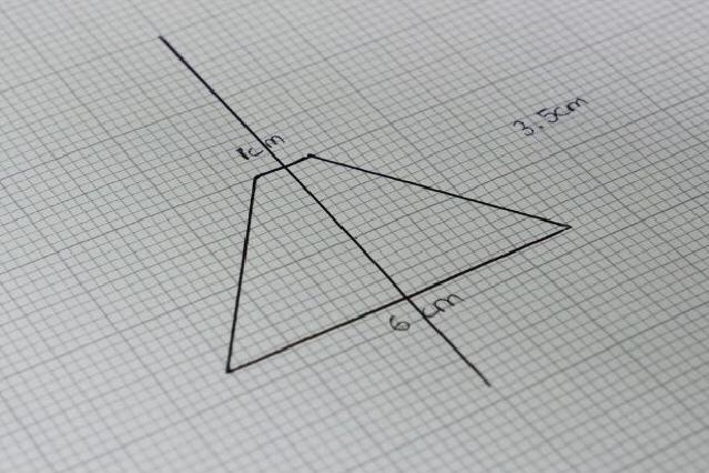Bước 1: Vẽ một hình thang cân trên giấy tập kẻ ô, kích thước đáy lớn 6 cm, đáy nhỏ 1 cm và cao 3,5 cm. Sau đó cắt ra.