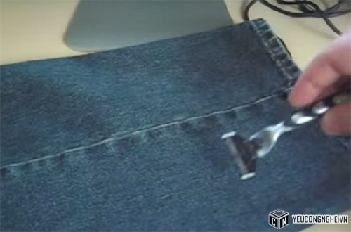 Việc đầu tiên bạn cần làm là phải có một chiếc quần jean, cũ hay mới thì đều có thể sử dụng được. Bạn đặt quần jean lên một bề mặt cứng (mặt bàn, sàn nhà). Sau đó bạn đưa dao cạo di chuyển theo chiều từ dưới đẩy lên trên của quần jean, bạn làm như vậy khoảng 15 lần.