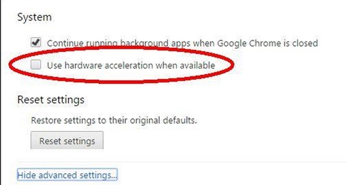 Trong giao diện vừa hiện ra, hãy kéo thanh cuộn xuống phía dưới màn hình. Sau đó, bấm vào tùy chọn "Show advanced settings". Cuộn tiếp màn hình xuống phía dưới, lúc này bạn sẽ thấy có một tính năng gọi là "Use hardware acceleration when available" đang được đánh dấu sẵn.
