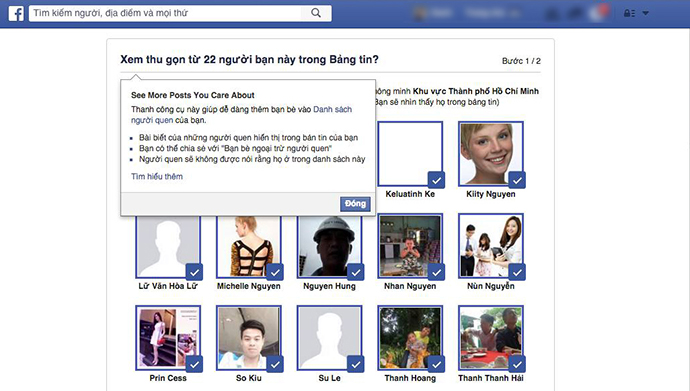 Bước 3: Tiếp theo, bạn hãy cân nhắc lại những người bạn ít tương tác nằm trong danh sách mà Facebook gợi ý, sau đó bỏ dấu check ở các ô tương ứng với người nào đó sao cho hợp lý.
