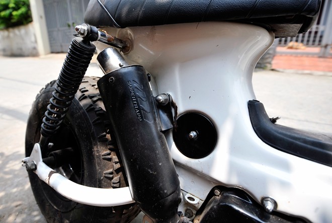 Chiếc Chaly màu trắng đời 79 sử dụng ống pô Supertrapp, cho tiếng ấm hơn khi tăng tốc với chiếc xe có bộ lốp khá to như thế này