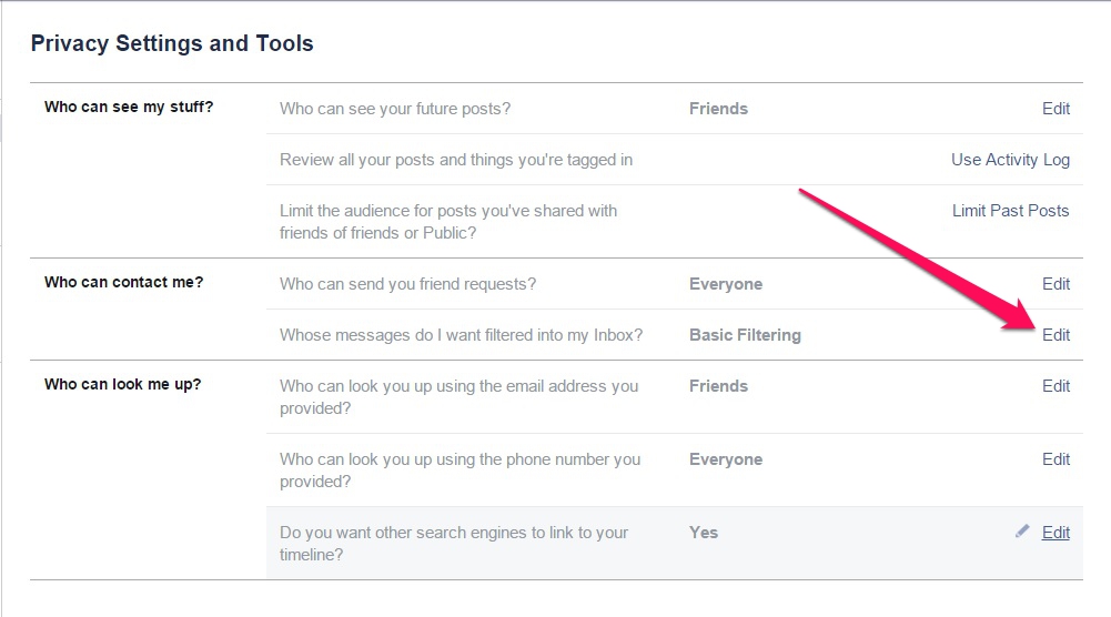 Trên hộp thoại sẽ hiện ra trường Who can contact me? (Ai có thể liên lạc với tôi?), nhấn vào nút edit (chỉnh sửa), bên phải dòng Whose messages do I want filtered into my Inbox (Tôi muốn lọc tin nhắn mà bất kỳ ai gửi đến hộp thư của tôi?).