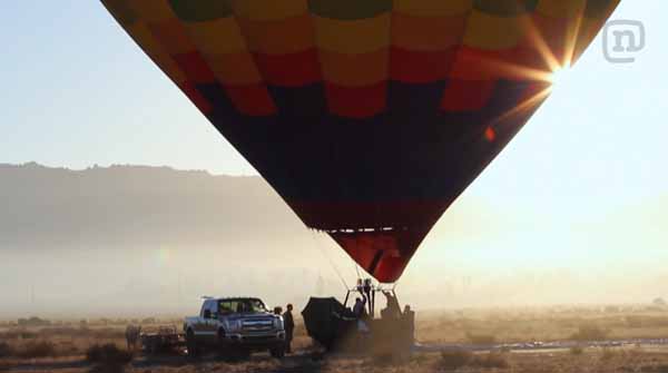 Erik treo mình lơ lửng phía dưới chiếc ô trong khi khinh khí cầu bay cao