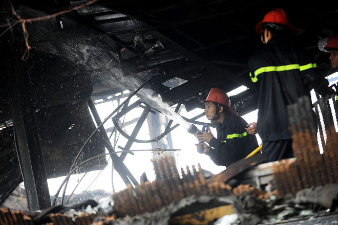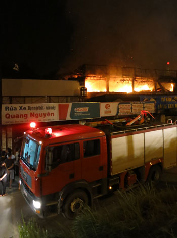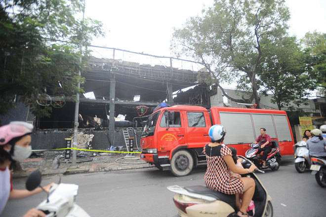 Ít nhất 20 lượt xe của cảnh sát phòng cháy chữa cháy Tây Hồ, Hoàng Mai, Tứ Liên... cùng cả trăm chiến sĩ lần lượt đến hiện trường tích cực phun nước từ nhiều phía vào ngọn lửa hừng hực đang bao phủ diện tích cả trăm mét vuông. Khói đen cuồn cuộn bốc lên trời. Trong ánh lửa, trần của quán dần sập xuống, trơ ra hệ thống khung sắt.
