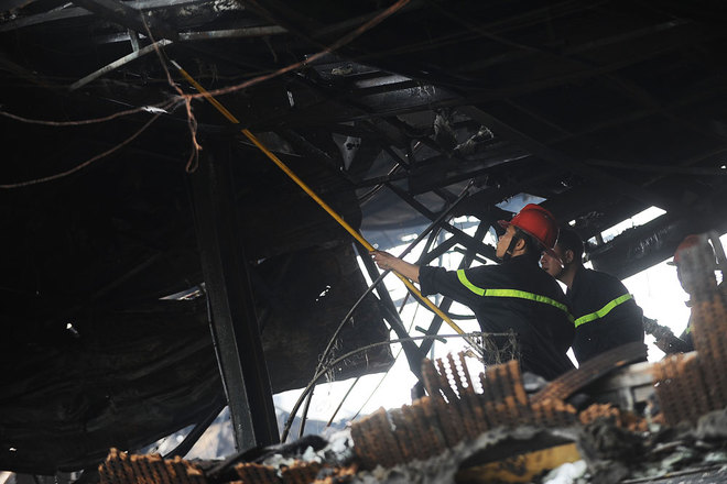 Bên trong tòa nhà, lực lượng cứu hỏa tiếp tục dò tìm những điểm có nguy cơ bùng cháy để phun nước làm mát. Công tác khám nghiệm hiện trường, điều tra nguyên nhân cũng được triển khai.