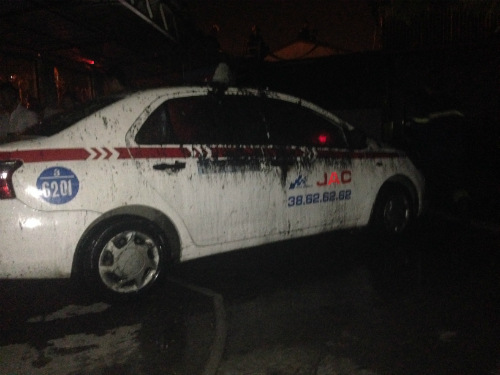 | Một chiếc taxi được lôi ra từ phía sau quán, ám khói đen kịt. Ảnh: Linh Đỗ. |