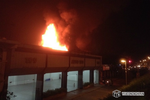 | Showroom ôtô sát đám cháy phải vội vàng chuyển xe ra đường trong đêm. Ảnh:Vitalk. |