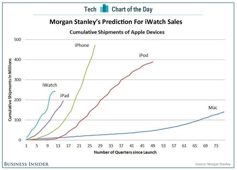 Morgan Stanley đã lập ra một sơ đồ dự đoán trước doanh thu của iWatch so với các thiết bị Apple khác.