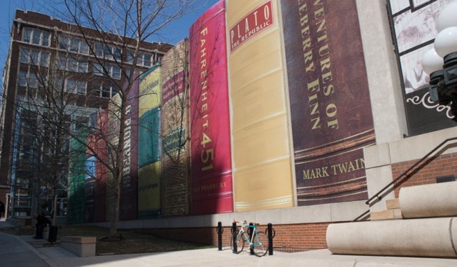 Thư viện tọa lạc giữa phố Wyandotte và đại lộ Baltimore, hoàn thành năm 2004 với bề ngoài giống như những cuốn sách cao 7,6 mét, rộng 2,75 mét, mỗi cuốn tượng trưng cho một tác phẩm được yêu thích nhất. Mỗi khối nhà là một gáy sách theo phong cách cổ điển, với những tên tuổi lừng danh của văn học như: Chúa tể chiếc nhẫn, Giết chết con chim nhại… cùng 20 đầu sách khác.