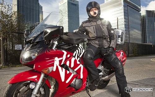Tài xế xe ôm của hãng Virgin mặc trang phục bảo hộ xịn với mũ có micro để trò chuyện với hành khách.