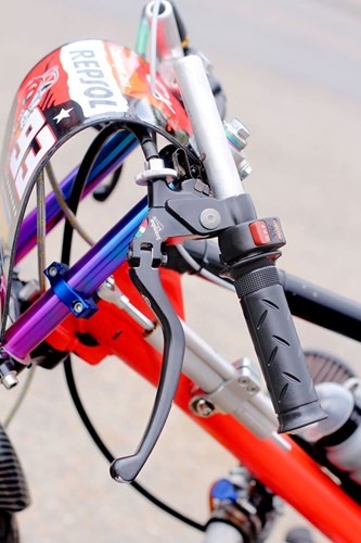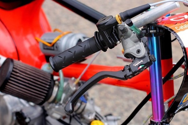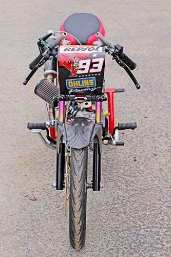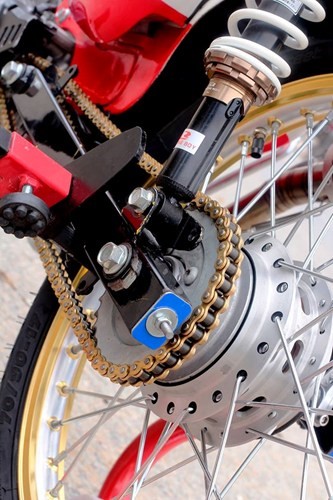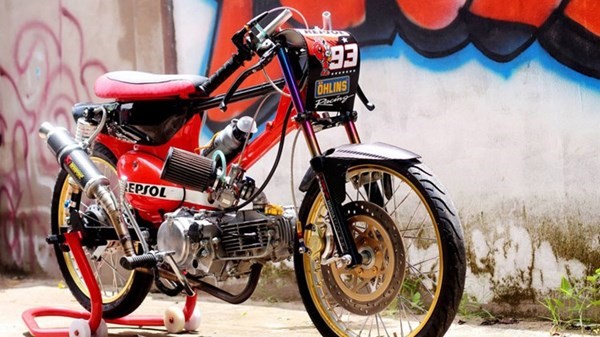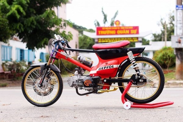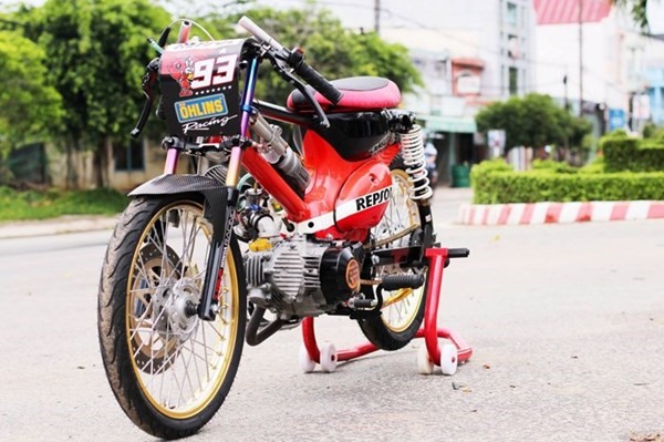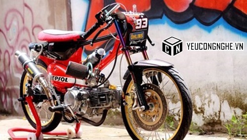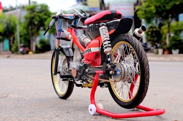 Đây có thể coi là một tuyệt phẩm Honda Cup không chỉ đến từ vô số hàng hiệu trang bị trên xe mà còn bởi sự khéo léo và con mắt thẩm mỹ của chủ xe. Chiếc Cup này được trang bị ghi đông cụp xuống 2 tay lái, dàn chân đi bánh căm đậm chất drag Thái.