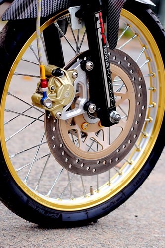 Dàn bánh căm niềng nhôm sáng bóng cùng heo Brembo đối xứng, dĩa lớn đồ chơi.