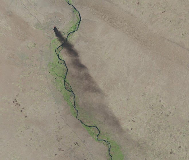 Chùm đen khói kéo dài phát ra từ nhà máy lọc dầu lớn nhất Iraq vào ngày 18/6/2014 sau khi phiến quân tấn công các nhà máy lọc dầu.
