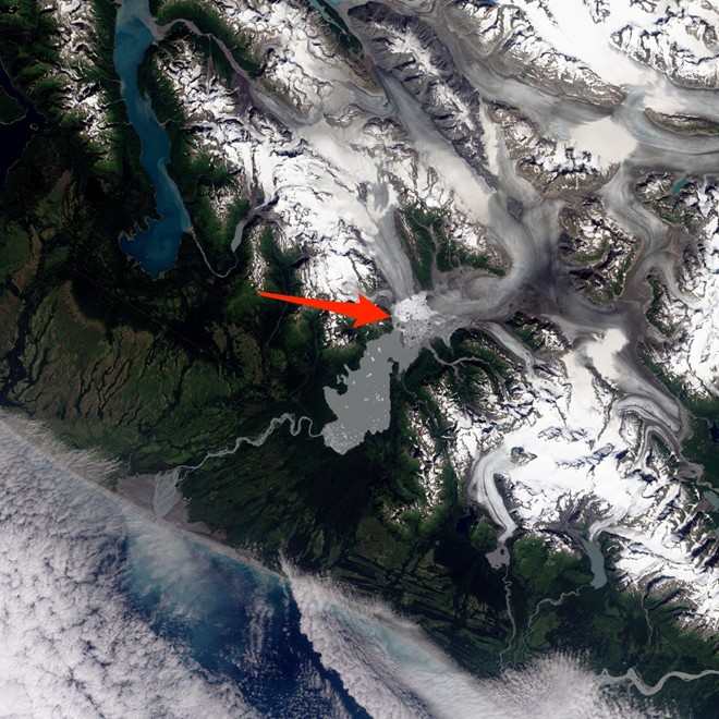 Harlequin, tên của hồ nước bên cạnh sông băng Yakutat, Mỹ, vào ngày 13/8/2013. Các nhà khoa học nhận định Yakutat là một trong những sông băng tan nhanh nhất của thế giới. Mũi tên đỏ chỉ vào các tảng băng trôi đang hình thành.