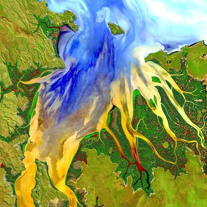 Trầm tích và dòng phù sa (biểu thị bởi màu xanh, vàng, đỏ) gần một cửa sông ở phía tây Australia giống như con bạch tuộc  nhiều màu sắc.