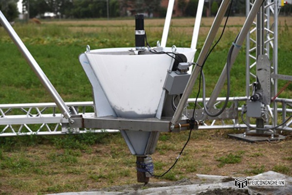 Bộ khung hỗ trợ cho đầu phun khổng lồ di chuyển theo vòng tròn, từ từ phun nguyên liệu từng lớp, từng lớp một tạo thành những bức tường và các phần khác của ngôi nhà.