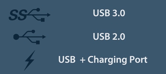 Trên đây là 3 biểu tượng phổ biến nhất thường xuất hiện trên các cổng USB trên một chiếc máy tính, mỗi biểu tượng đều thể hiện một cổng USB khác nhau (USB 3.0, USB 2.0 và cổng USB dùng để sạc)