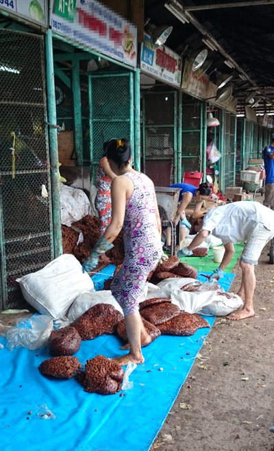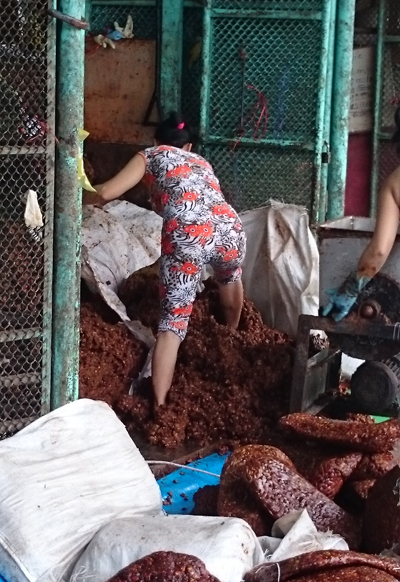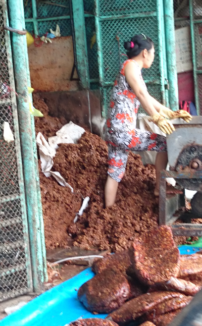 Ba người phụ nữ, một người đàn ông đi chân đất giẫm đạp lên me, rồi đóng thành từng khối bày la liệt trên nền đầy rác.