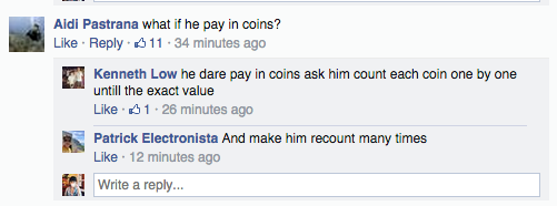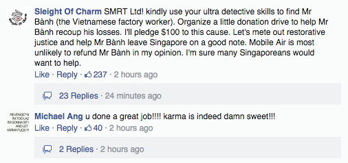 "Hãy tổ chức một cuộc quyên góp để giúp Mr. Bành. Tôi sẽ quyên góp 100$ cho việc này. Hãy giúp Mr. Bành rời Singapore với một cảm xúc tốt đẹp. Mobile Air dường như sẽ không chịu trả lại tiền cho Mr. Bành đâu, theo ý kiến của tôi. Nhưng tôi chắc chắn rằng nhiều người Singapore sẽ muốn giúp đỡ".