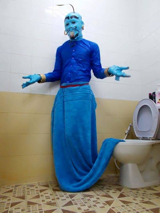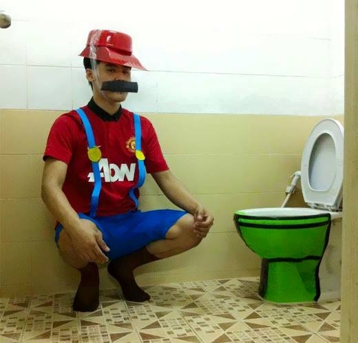 Bạn muốn làm anh chàng Mario? Hãy tham khảo anh chàng này, chỉ cần 1 cái xẻng rác, 1 cái bát, thêm cái râu băng dính đen là đủ bộ.