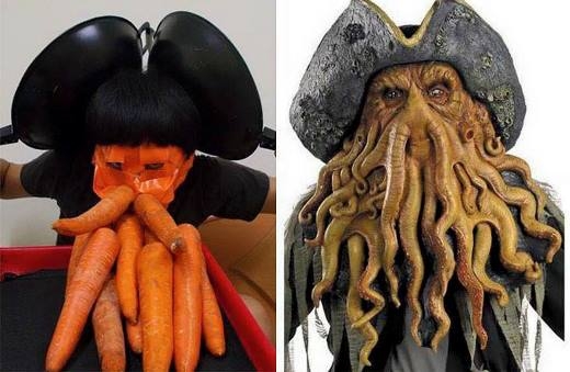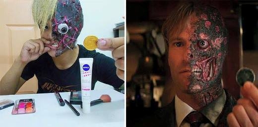 Để có được gương mặt giống với nam chính trong bộ phim Người hai mặt, anh chàng này đã trang điểm khá cầu kỳ. Có lẽ điểm nhấn ở bức ảnh chính là chiếc đồng xu trong phim được thay bằng miếng sô cô la đồng xu.