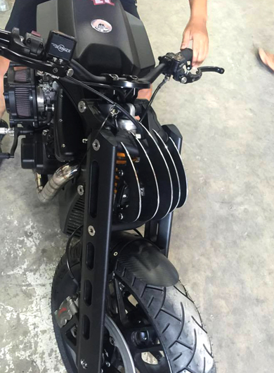 Giảm xóc trước dạng dầm ngang (girder) với lò xò nằm gọn bên trong hai càng trước, không giống loại hành trình ngược thường thấy trên xe phân khối lớn. Xe dẫn động bằng dây đai nằm bên phải, ngược lại so với kiểu nằm bên trái của hầu hết các xe thương mại.