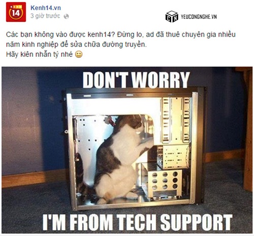 Kênh 14 thông báo sự cố trên Facebook. Ảnh chụp màn hình lúc 16h15 ngày 13/10/2014.