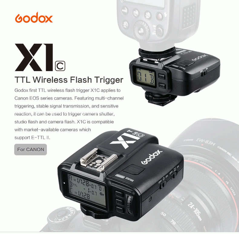 Sản phẩm trigger X1-C, hỗ trợ TTL và HSS, hệ thống kết nối radio không dây 2.4 GHz cho các máy ảnh DSLR Canon.