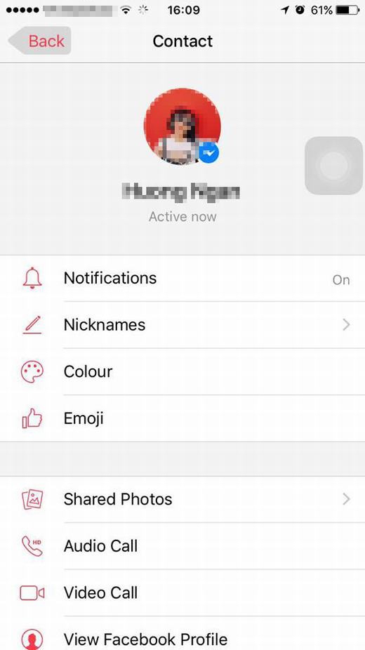Truy cập ứng dụng Messenger > Chọn người cần trò chuyện > Nhấp vào tên (phía trên, chính giữa đối với IOS, phía trên, bên trái đối với Android) > Giao diện này hiện ra.