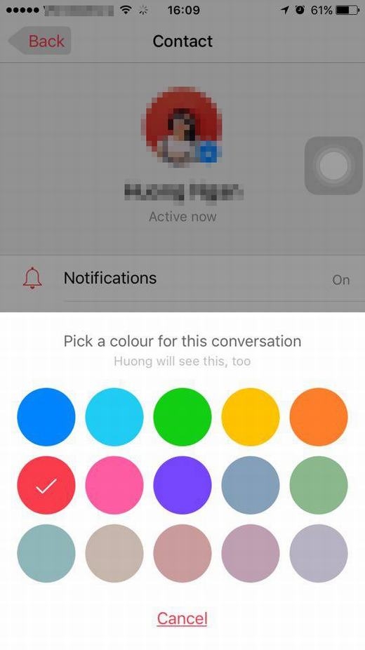 Để đổi màu sắc cho nền chữ nhắn tin (và cả nền cuộc trò chuyện), bạn trở lại tùy chọn, nhấn vào tên người cần nhắn tin (hình đầu tiên) > nhấn vào Colour (Màu sắc) > chọn màu mình yêu thích.