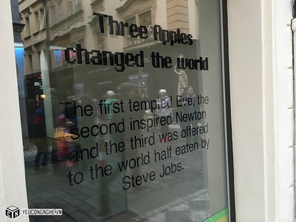 Trên một khung cửa kính có đề dòng thông điệp cho rằng có ba"trái táo" thay đổi thế giới và Apple là một trong số đó.