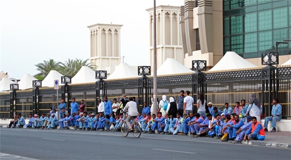Nhóm công nhân chờ xe buýt để về khu vực sống tập trung, bỏ lại phía sau thành phố Dubai hoa lệ trong mắt khách du lịch.