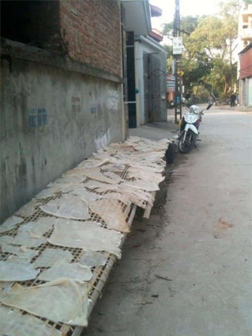 Chỉ tính riêng trong một buổi chiều 13/11, cơ sở ông T đã tẩy rửa và chế biến khoảng 7 tạ da thành bì lợn. Sau khi ngâm tẩy, những miếng da lợn được xếp phơi ngay ngoài đường, mặc cho bụi bặm bay vào.