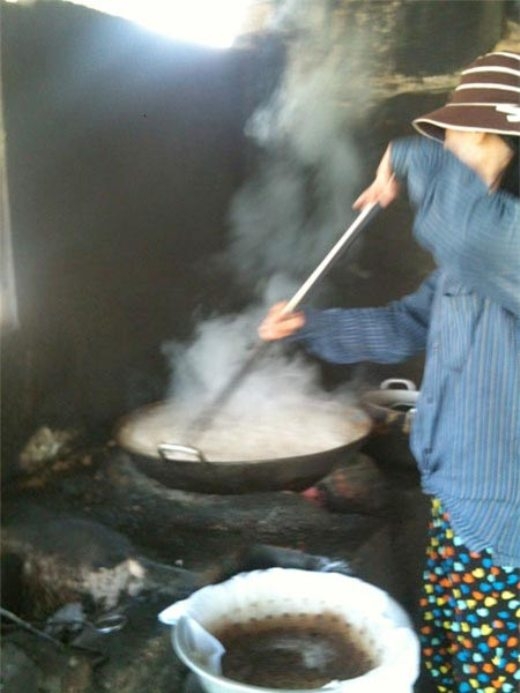 Lọc mỡ xong, bà H dùng xẻng xúc mỡ, bạc nhạc, dính đầy lông, phân, cát đổ thẳng vào chiếc chảo gang đen ngòm đang bắc trên bếp mà không cần rửa. 10 phút sau, chảo mỡ sôi ùng ục, một mùi khét lẹt lờm lợm bay ra.