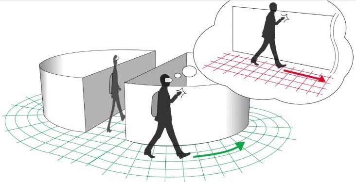 Với tên gọi "đổi hướng đi bộ", nhóm nghiên cứu tại Đại học Tokyo cho biết về cơ bản công nghệ này sẽ đánh lừa não bộ của người dùng để họ suy nghĩ rằng đang đi theo một đường thẳng nhưng thực ra là trên một đường cong nhẹ bằng cách cho họ xem hình ảnh đánh lừa trong thế giới ảo kết hợp với việc liên tục chạm tay vào một "bức tường" cong.
